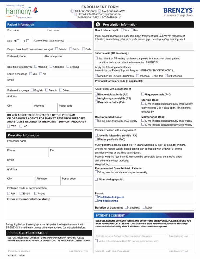 Arthritis, BC, eForms, Medication Coverage, ON, QCBrenzys (etanercept) PSP Enrolment Form Harmony 2025EMReachSeptember 24, 2025