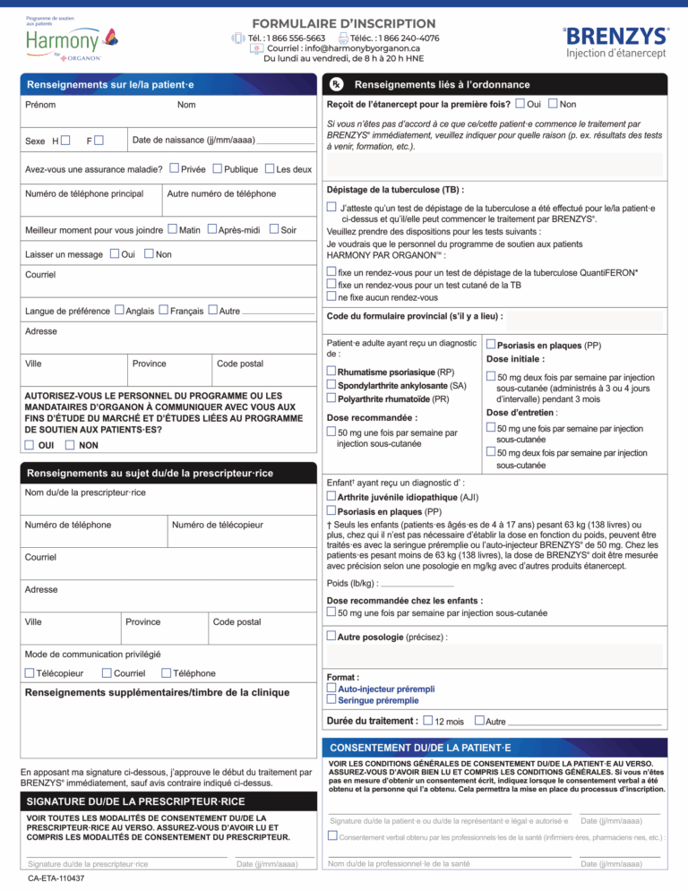 Arthritis, eForms, Medication Coverage, QCBrenzys (etanercept) PSP Formulaire d’inscription Harmony – 2025EMReachSeptember 24, 2025