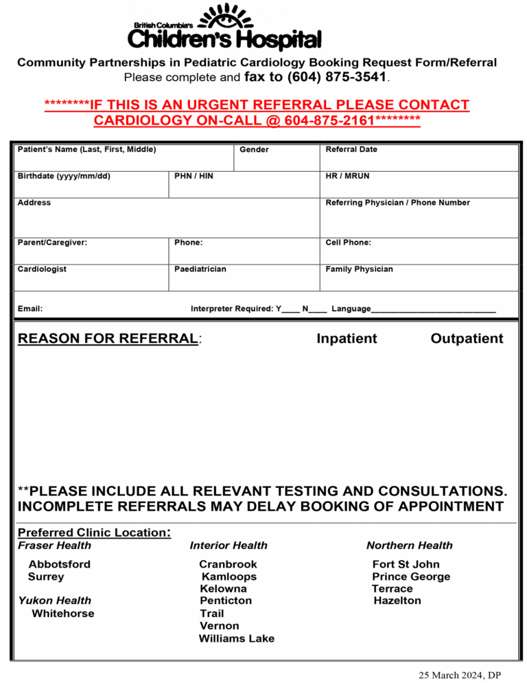 BC Children’s Hospital Community Pediatric Cardiology Referral 2024