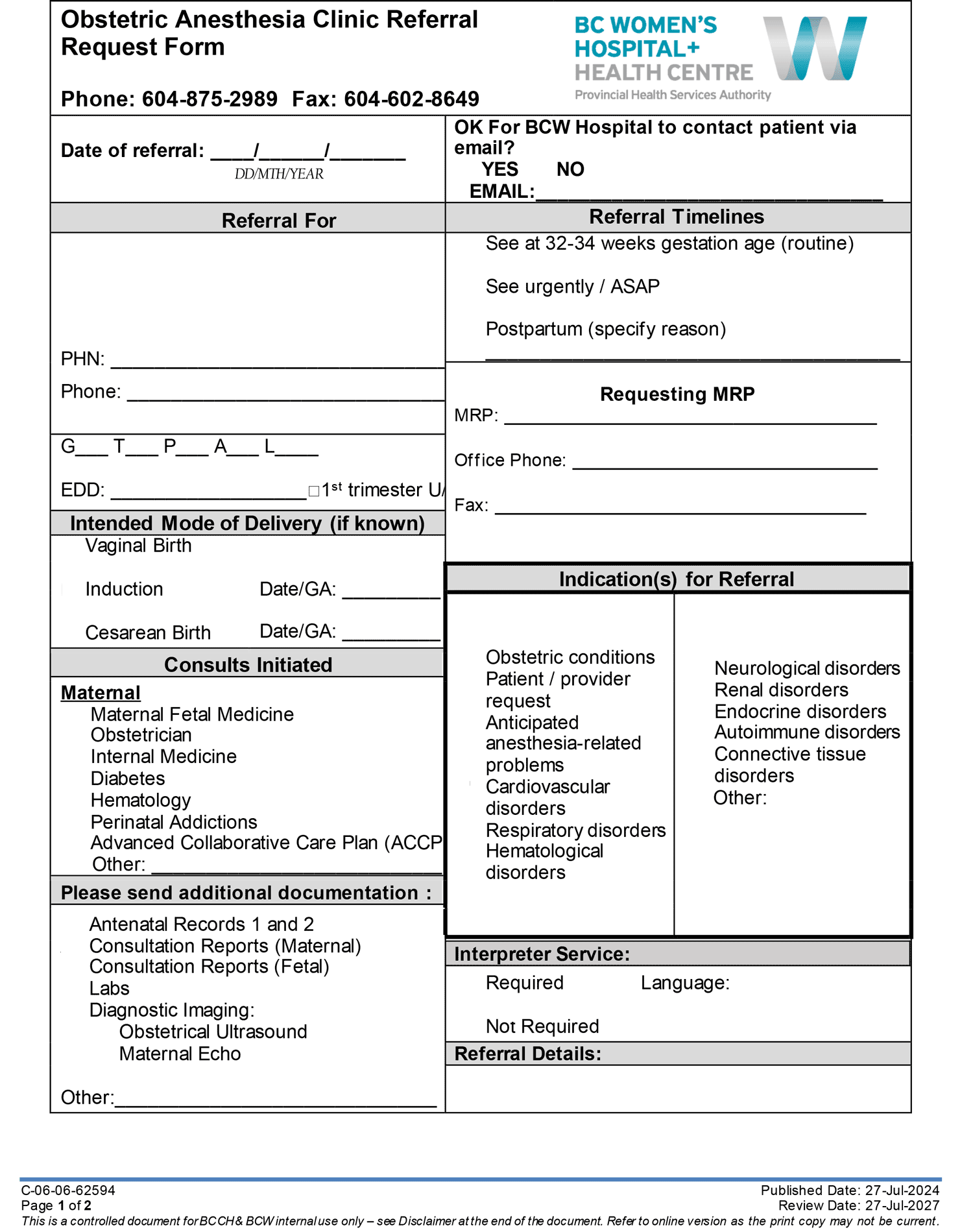 BCWH OB Anaesthesia Referral