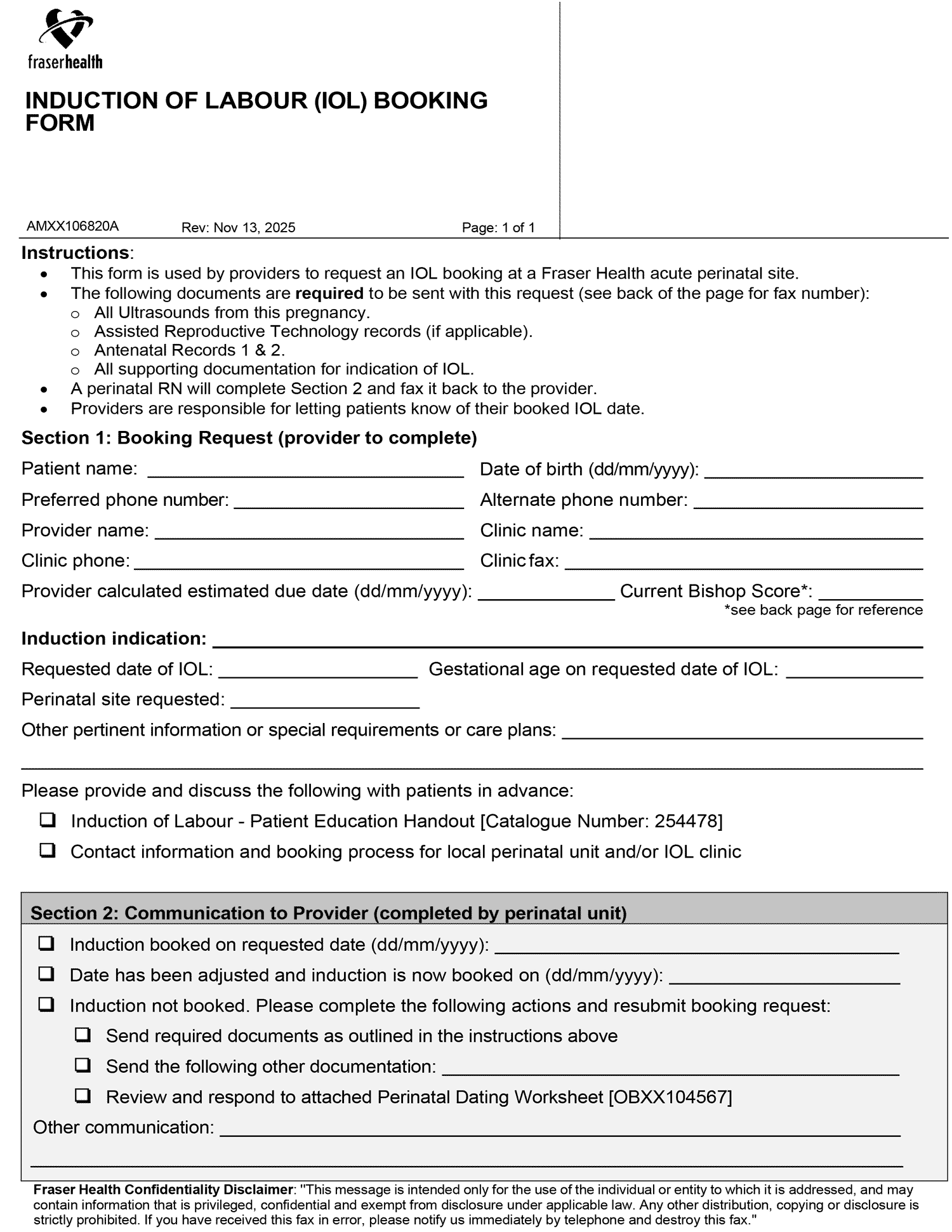 To be used for booking induction of Labour In Fraser Health. The second page has the bishop score and can be clicked to calculate the score.