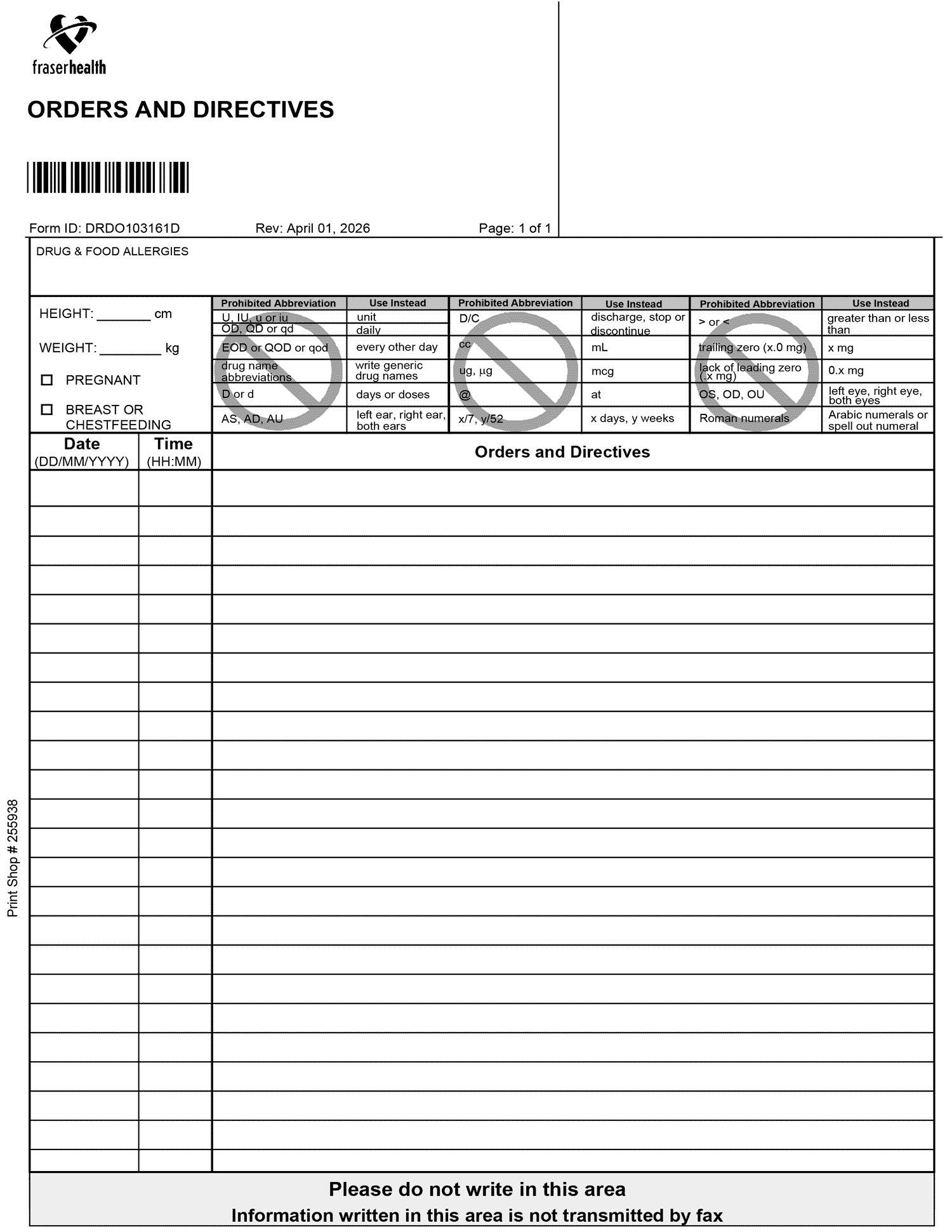 A Fraser Health Order sheet with a side menu for various orders. Side menu includes reference material and links to certain PPOs. For when you wish to send orders from your office to a Fraser Health Facility.