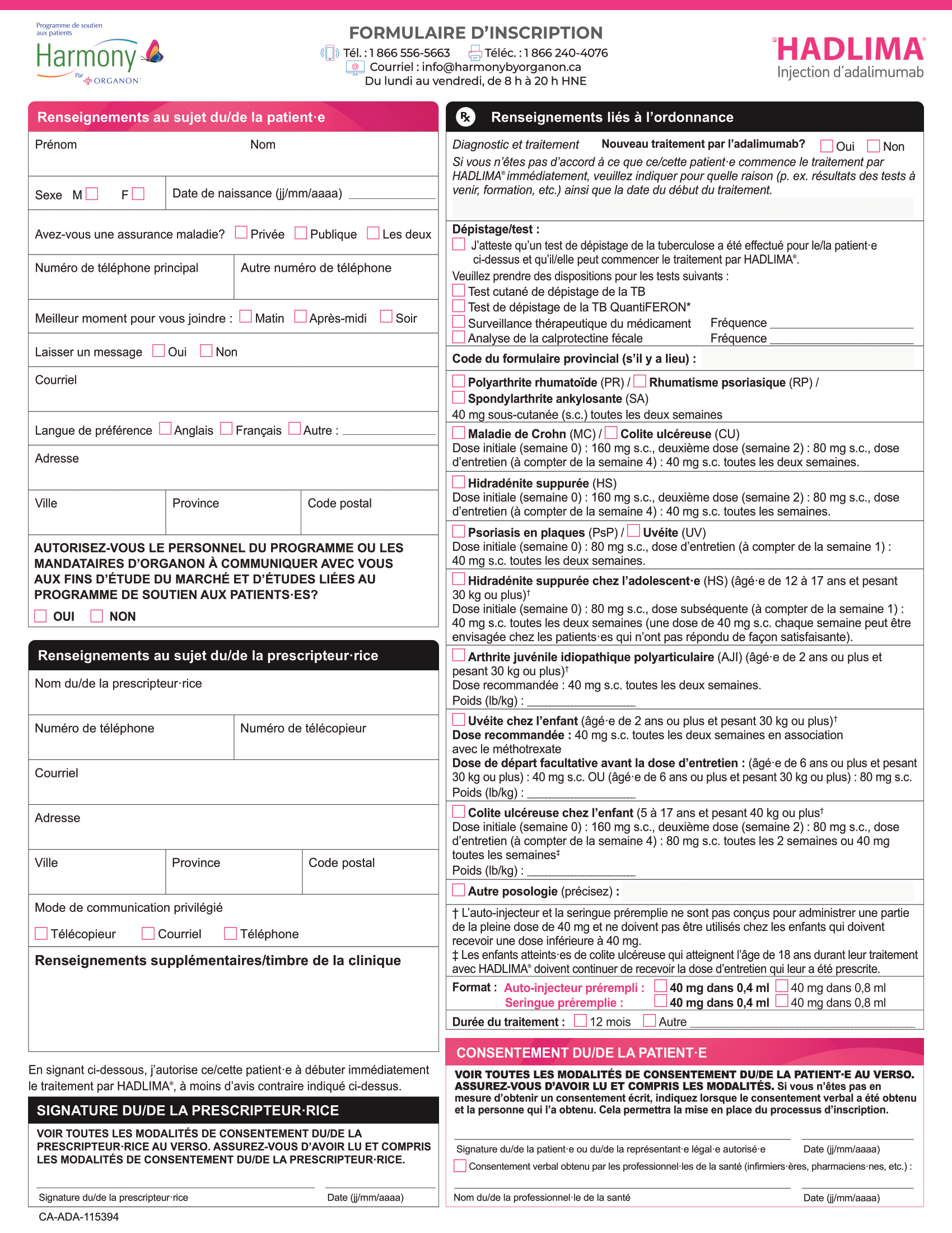 Hadlima (adalimumab) PSP Formulaire d’inscription Harmony - 2025