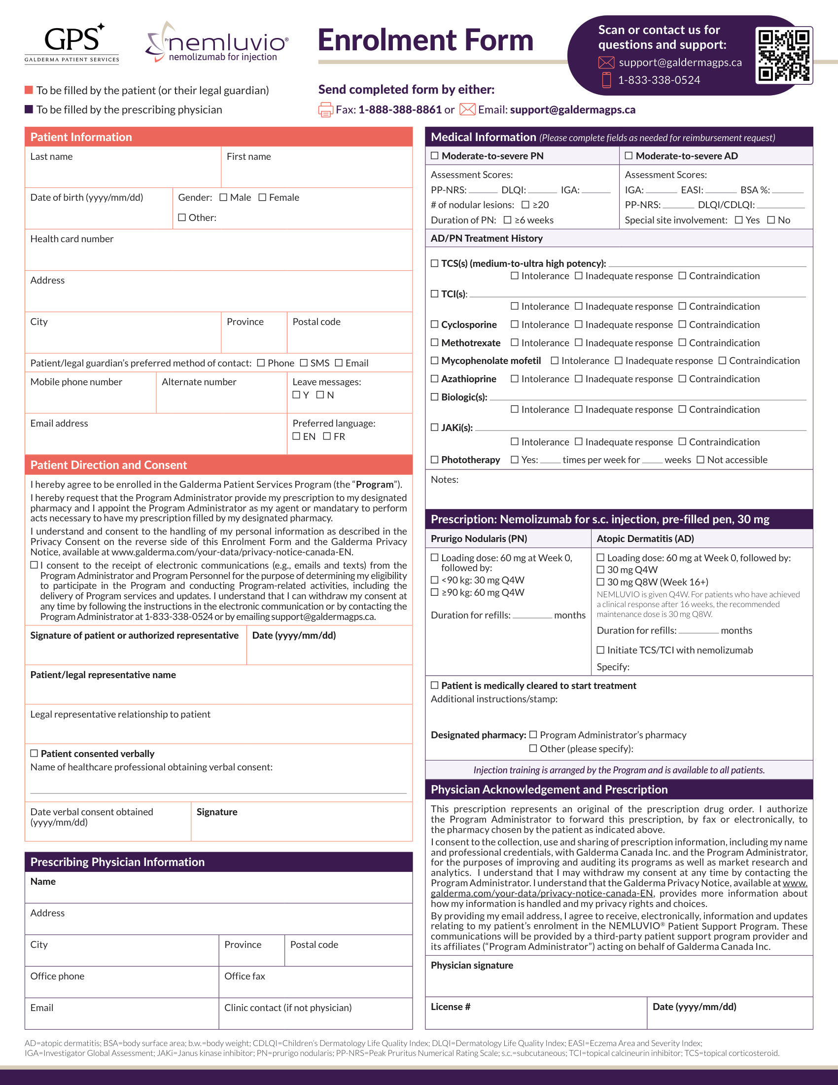 Nemluvio (nemolizumab) PSP Enrolment Form – 2026EMReachFebruary 6, 2026BC, eForms, Medication Coverage, ON, QC Version Download 6 File Size 401.61 KB File Count 1 Create Date February 6, 2026 Last Updated February 6, 2026 Nemluvio (nemolizumab) PSP Enrolment Form - 2026 Attached Files and Latest Versions 1 file Nemluvio_nemolizumab_PSP_Enrolment_Form_2026.zip401.61 KBDownload Nemluvio nemolizumab