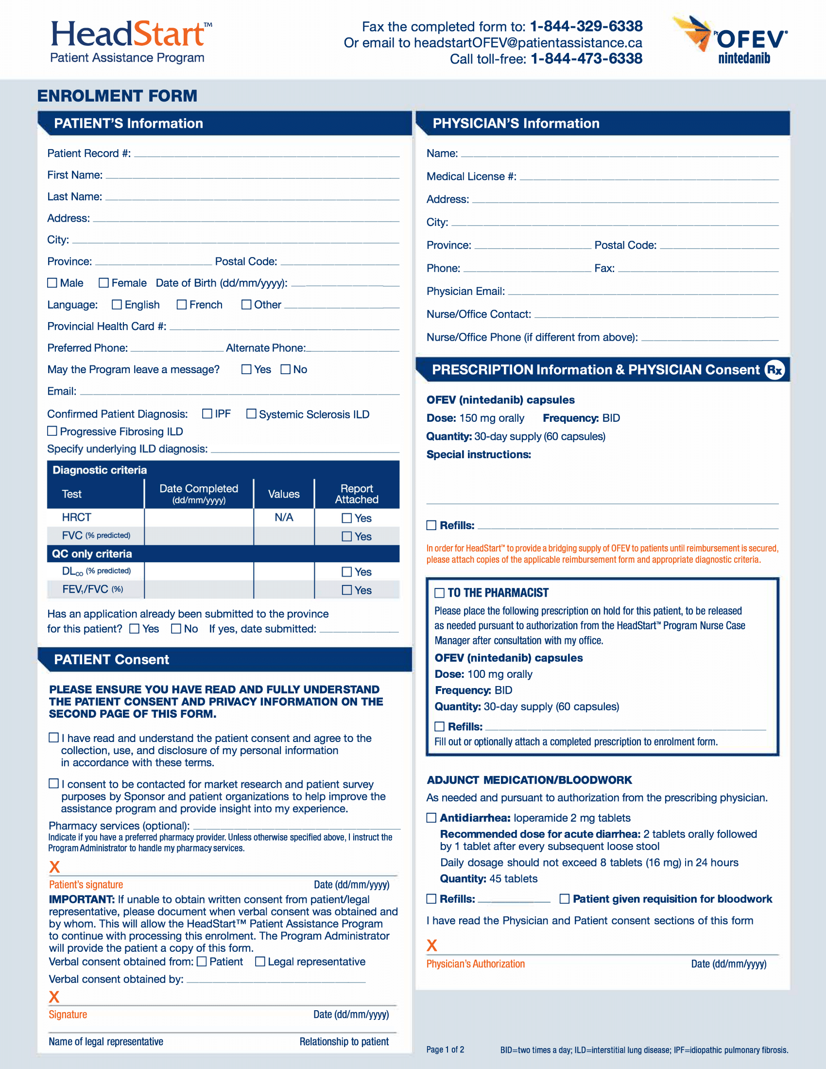 OFEV (nintedanib) HeadStart PSP Enrolment FormEMReachFebruary 2, 2026BC, eForms, Medication Coverage, ON, QC Version Download 2 File Size 1,010.39 KB File Count 1 Create Date February 2, 2026 Last Updated February 2, 2026 OFEV (nintedanib) HeadStart PSP Enrolment Form Attached Files and Latest Versions 1 file OFEV_nintedanib_HeadStart_PSP_Enrolment_Form.zip1010.39 KBDownload nintedanib OFEV
