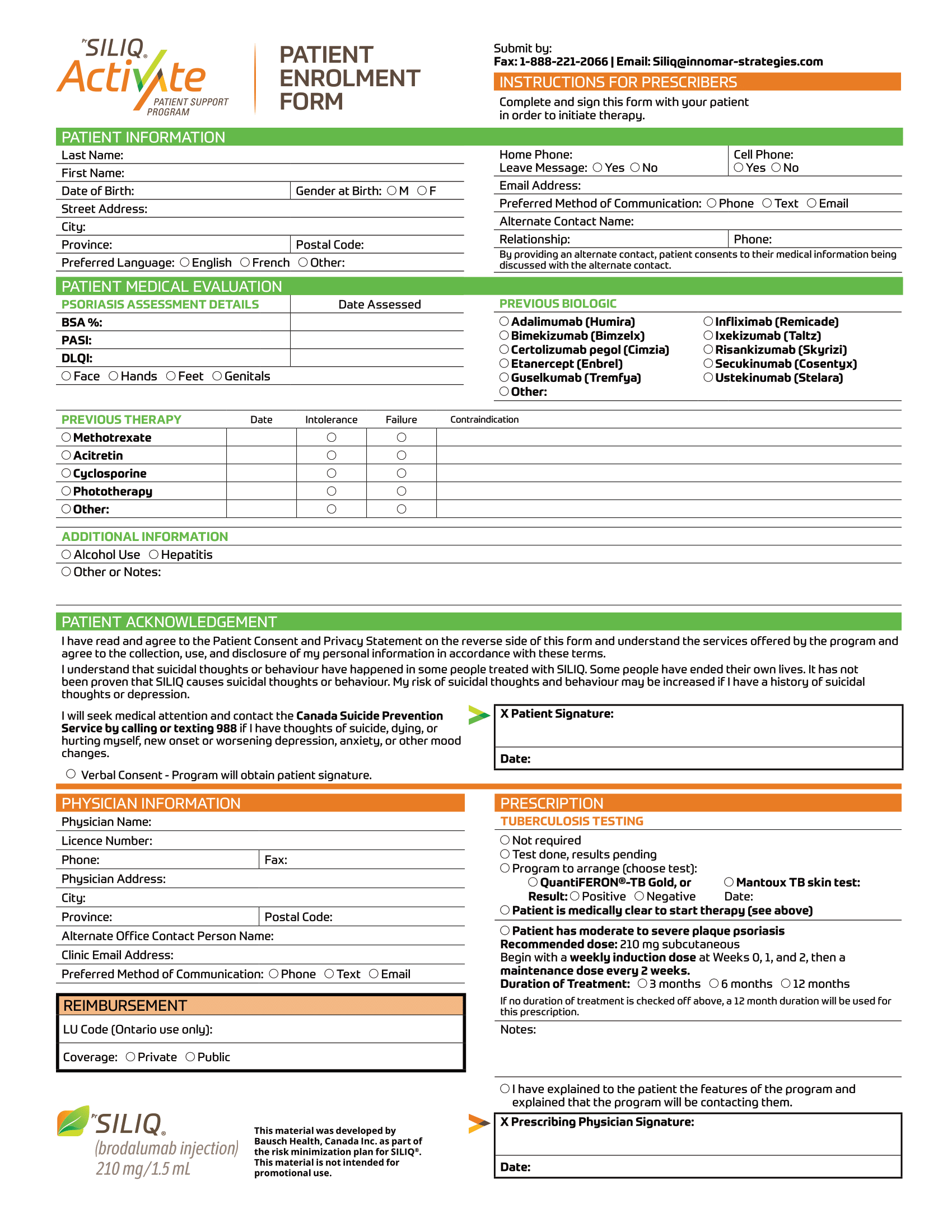 Siliq (brodalumab) PSP Enrolment Form 2025EMReachMarch 20, 2024Dermatology, eForms, Medication Coverage, ON, Rheumatology Version Download 374 File Size 656.56 KB File Count 1 Create Date March 20, 2024 Last Updated December 16, 2025 Siliq (brodalumab) PSP Enrolment Form 2025 Attached Files and Latest Versions 1 file Siliq_brodalumab_PSP_Enrolment_Form_2025.zip648.97 KBDownload brodalumab Siliq